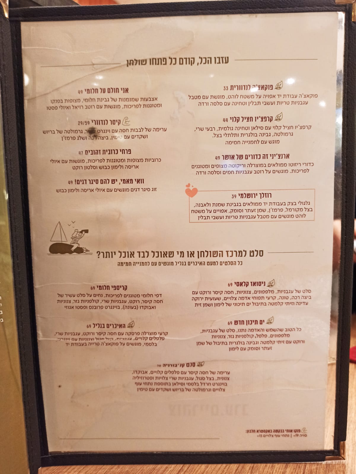עמית האחמ"ש חזר באוזנינו על המלצותיו, ובכוחות משותפים בחרנו: קרפצ'ו חציל קלוי עם סילאן וטחינה (44 ש"ח), סלט קיסר לנדוורי (29/59 ש"ח, לזוג / יחיד), מרק פטריות בלחם (54 ש"ח). למעשה, הוא גם מאוד המליץ על הרוזלך החדשים (שמוצעים כפתיח, כי הם ממולאים בגבינות, בניגוד לרוזלך הקלאסיים של לנדוור שמוצעים כקינוח), אבל שכחנו להזמין.