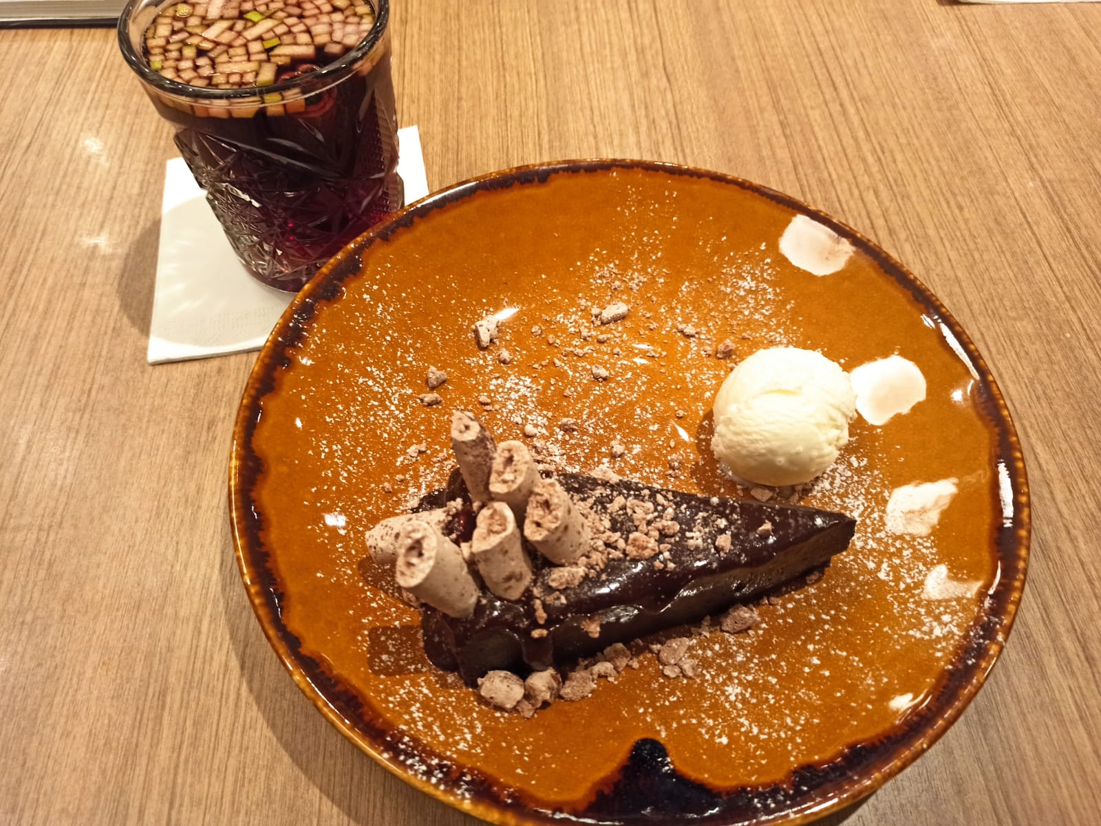 את הפיצוי על הנוזל החם שקיוויתי למצוא במרק, קיבלתי בסוף הארוחה - בצורת סנגרייה חמה ומתוקה. יחד עם עוגת שוקולד איטלקית ספגתי את מנת הסוכר (שלא לומר: מכת הסוכר), זו היתה אחלה סיומת טעימה לארוחה.