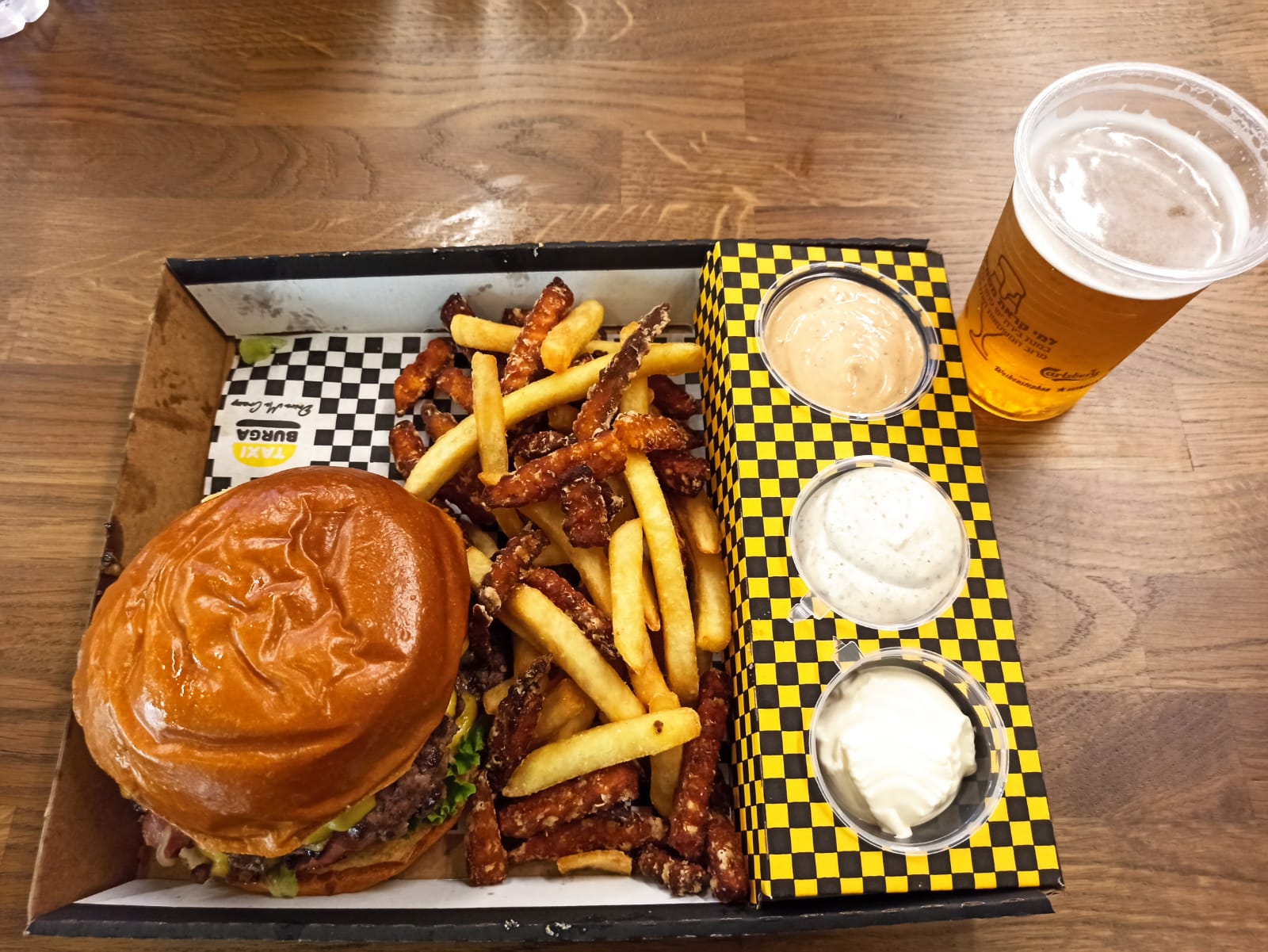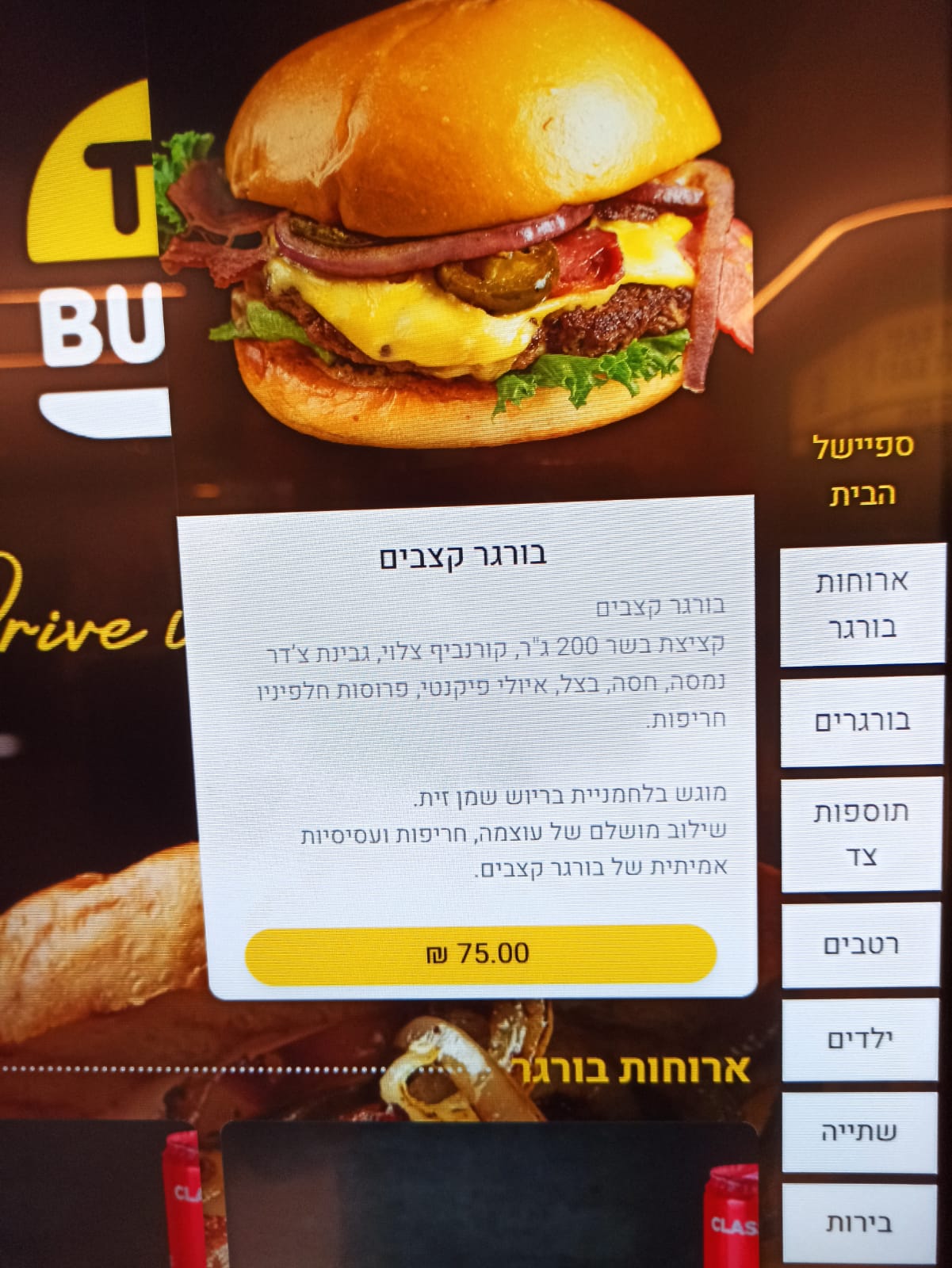 המקום רחב ידיים, ועם כמה אופציות מגוונות לישיבה. תפסנו שולחן צדדי, ומבלי לבזבז זמן מיותר ניגשנו לבחור מתוך מסך ההזמנות את ארוחת הצהרים שלנו. אפשר לבחור ארוחות בורגר, בורגרים, תוספות צד, רטבים, ארוחות ילדים, שתייה ובירות.