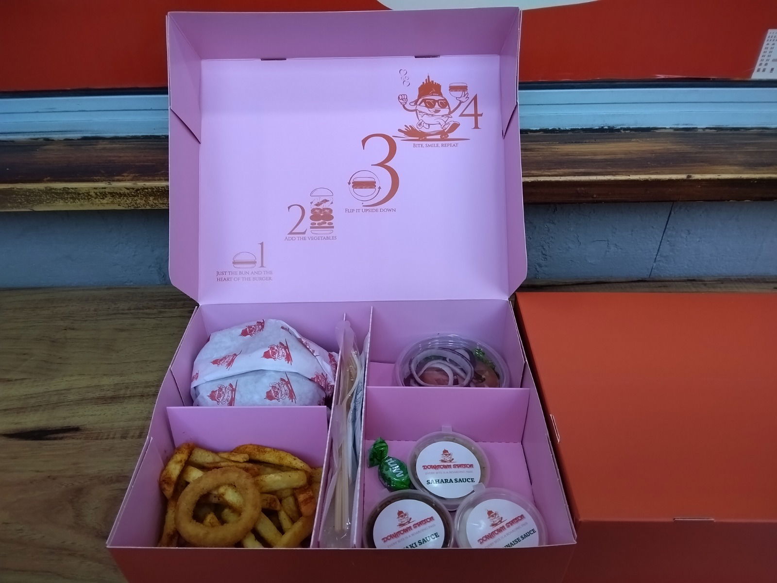 זוגתי ואני הזמנו 2 מנות: דובאי 01 (בשבילי), לונדון 17 (בשבילה). אל דאגה, זו לא בת הזוג מלונדון... כעבור כעשר דקות הוציא לנו שאדי שני מארזים יפים, שבכל אחד מהם המנה שנבחרה, צ'יפס, 3 רטבים, סלט קטן, סכו"ם פלסטיק, מפיות, קיסם שיניים, מפית לחה, כפפות ואפילו סוכריית מנטה שהזכירה לי נשכחות...