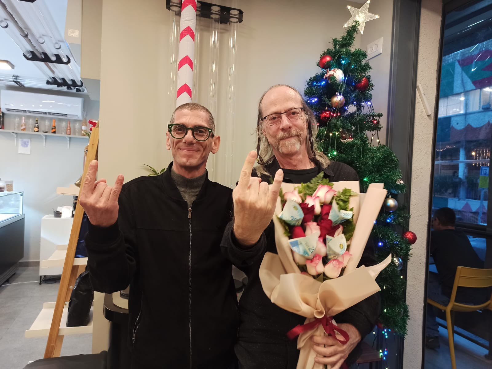 ועכשיו, תתבוננו בתמונה הזו שלי עם פאדי. למה אני מבסוט? כי בזמן שהצטלמתי איתו, כשהאשוח מאחורינו, הגיח מישהו (שאני לא מכיר) מהרחוב ודחף לי ליד זר פרחים, שבתוכו מגולגלים לא מעט שטרות של 200 ש"ח כל אחד. פעם היו לי מעריצות. עכשיו יש לי מעריצים...