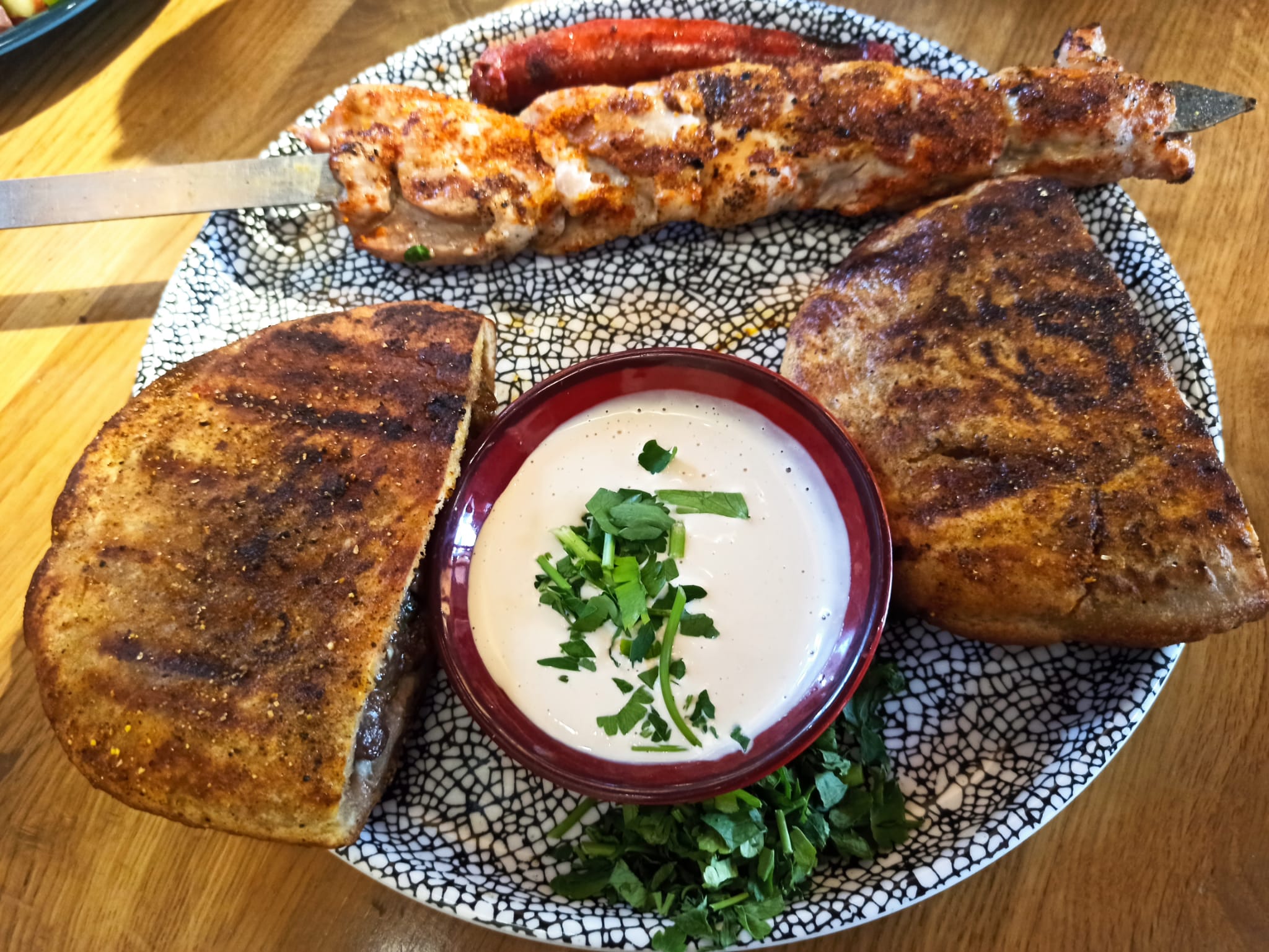 לא היה קשה לשכנע אותי, וזה היה כל כך טעים וחזק, עד כי ביקשתי וקיבלתי עוד פצצת שום כזו. אזכיר לטובה גם את החצילים המטוגנים (ואולי האפויים? כבר לא זוכר), שאהבתי מאוד, וגם את בשר הפרגית הרך והעסיסי שקילפנו מהשיפוד.