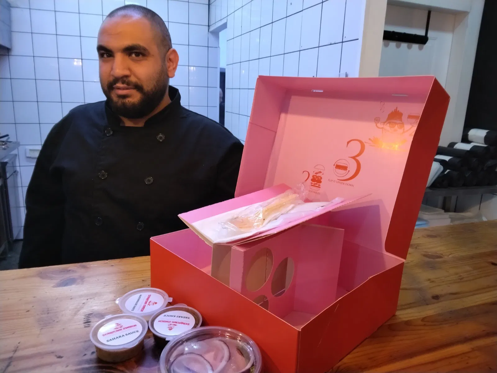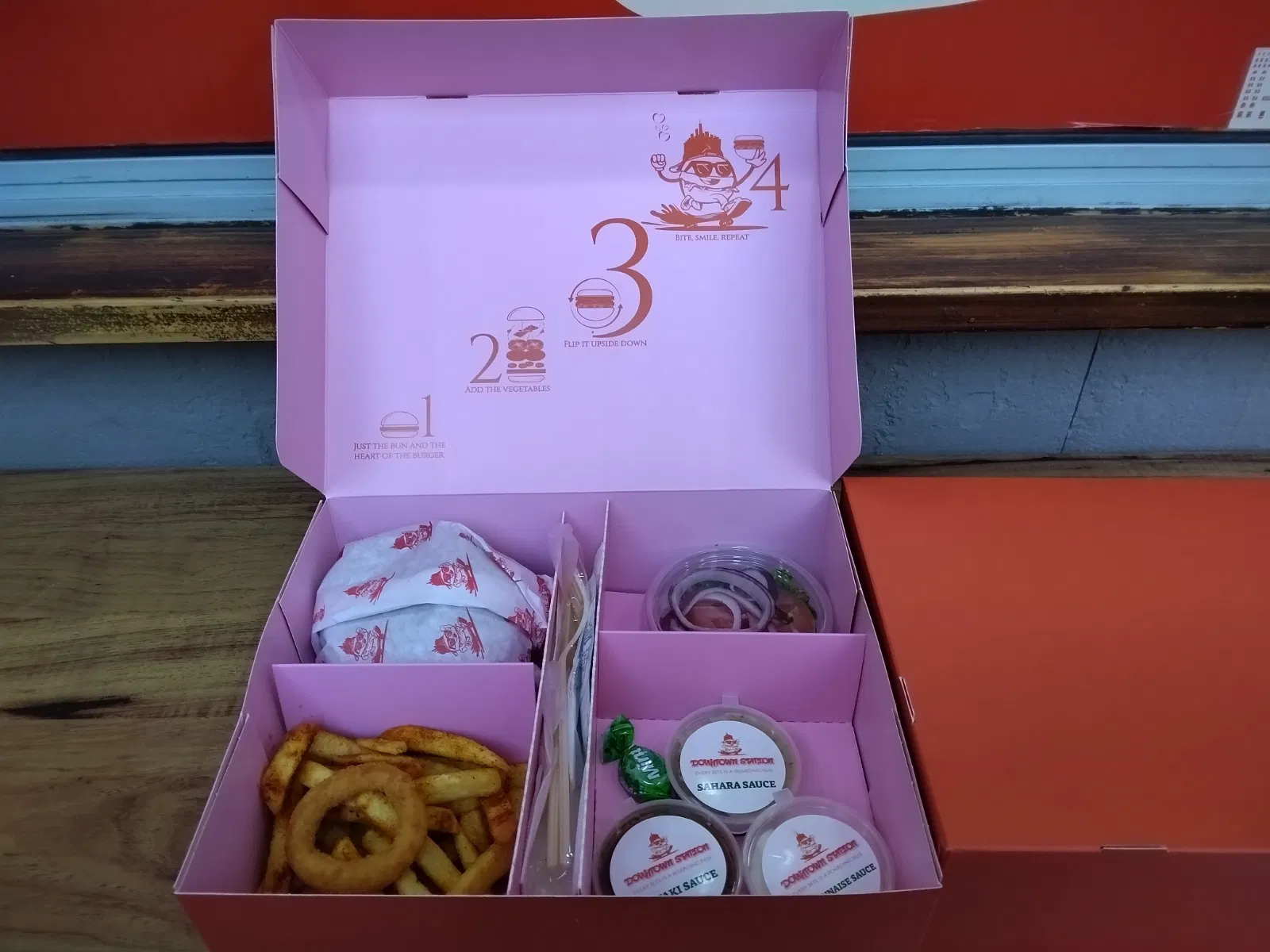 זוגתי ואני הזמנו 2 מנות: דובאי 01 (בשבילי), לונדון 17 (בשבילה). אל דאגה, זו לא בת הזוג מלונדון... כעבור כעשר דקות הוציא לנו שאדי שני מארזים יפים, שבכל אחד מהם המנה שנבחרה, צ'יפס, 3 רטבים, סלט קטן, סכו"ם פלסטיק, מפיות, קיסם שיניים, מפית לחה, כפפות ואפילו סוכריית מנטה שהזכירה לי נשכחות...