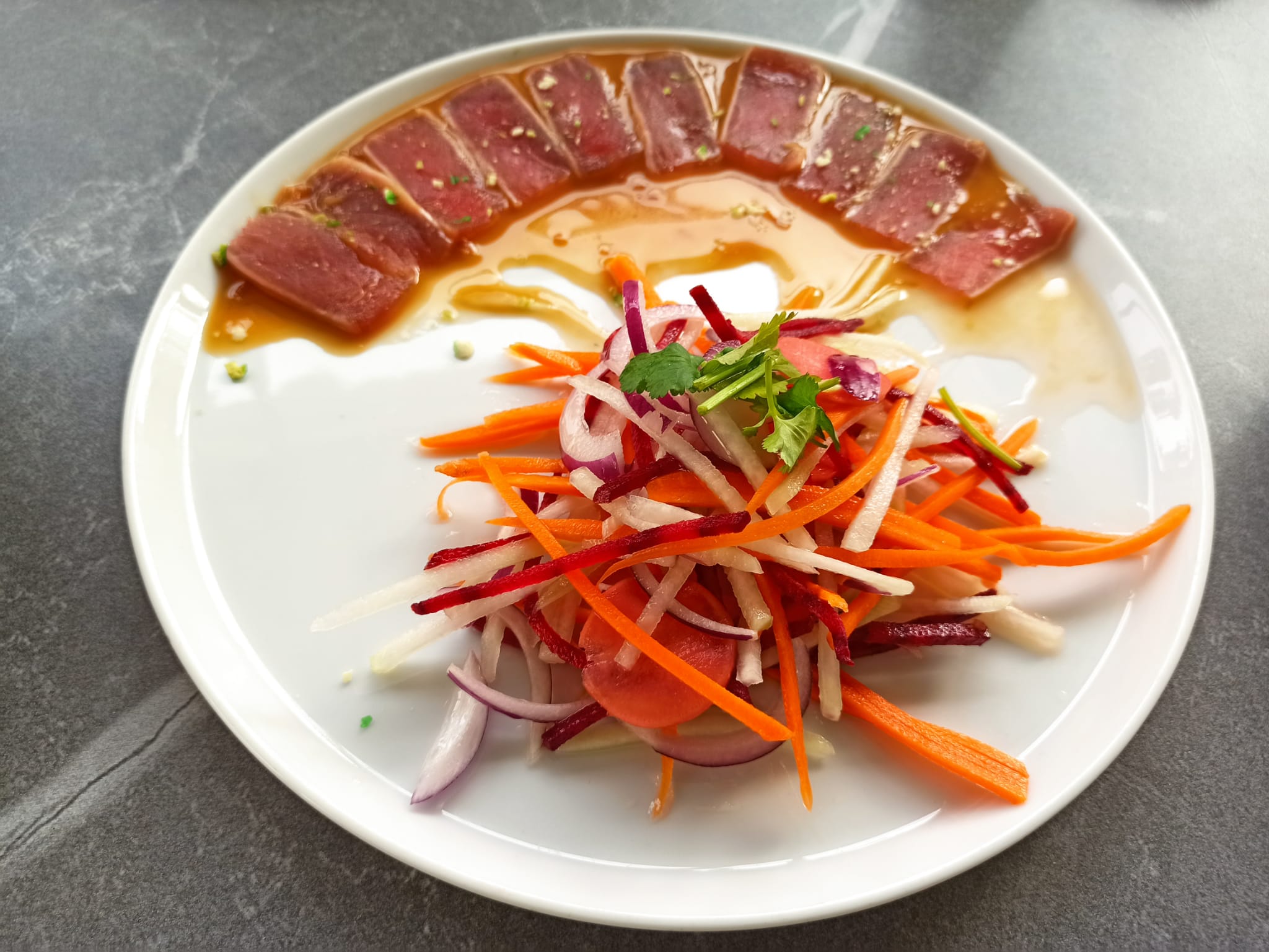 המלצרית הביאה לנו מהמנות הראשונות: טרטר סלמון, טרטר טונה, טאטאקי טונה. מהסושי: קוואשימה רול, אזומאמי רול (המנה הכי פופולארית כאן). סלט סעודת הקיסר, וגם עיקרית אחת שחלקנו: הו-צ'י-מין טורי מוק.